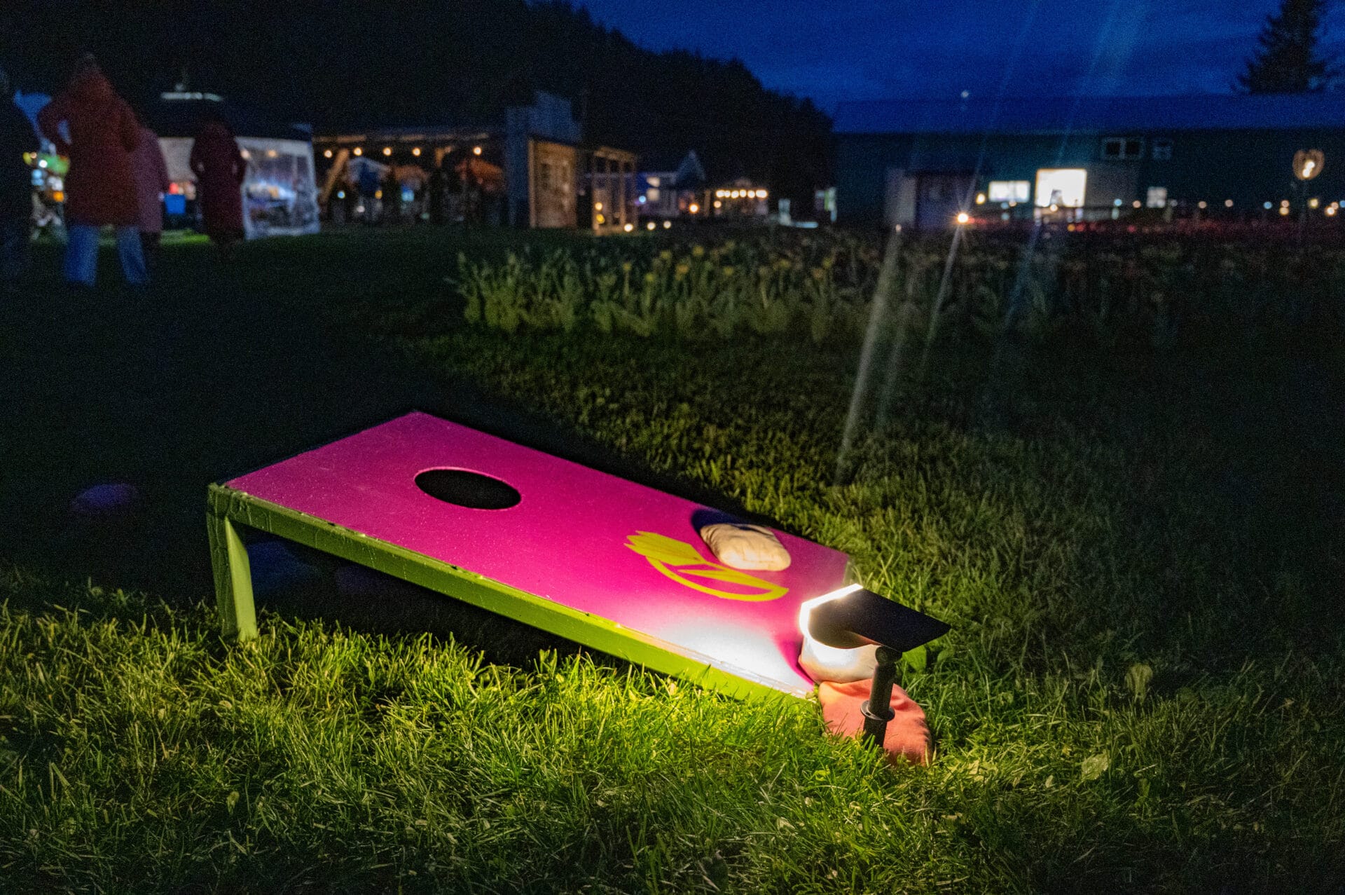 As the sun dips below the mountains and the sky transitions from blue to black, the Harrison Tulip Festival Night Garden begins to illuminate. Slowly at first — a glow here, a shimmer there. Like the first star appearing in an evening sky. Then another. Then another. Until suddenly the whole garden is alive with dancing lights.