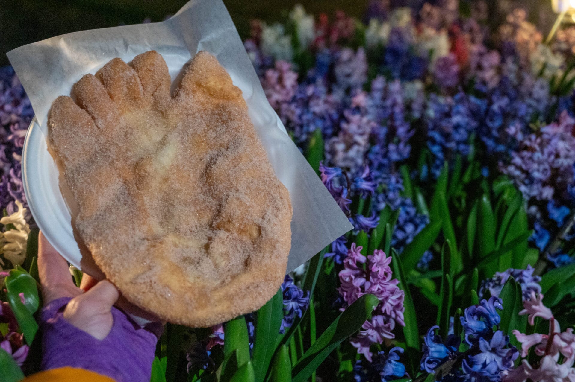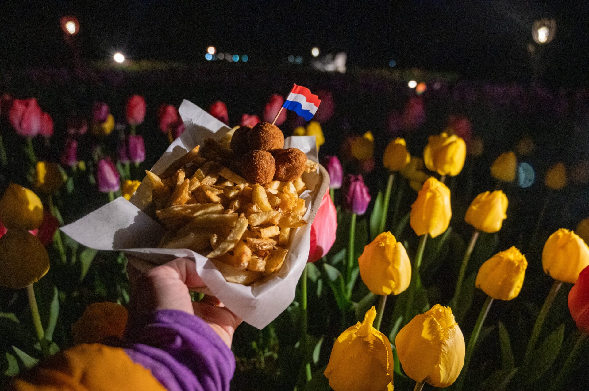 The food truck at the Harrison Tulip Festival Night Garden is an indulgence in all the deep-fried treats we love. The smell of cinnamon sugar sasquatch feet, the classic Canadian favourite that is poutine, the Dutch food. The smells from the food truck mingle with the sweet fragrance of fourteen million blooms — and somehow it works, it oddly works! Here are some of the photos of the yummy food we shared: